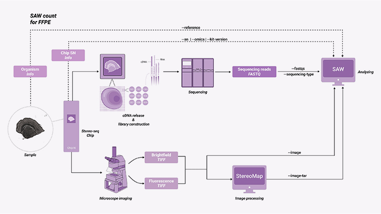 Stereo-seq Analysis Workflow (SAW) 现已作为独立的 TAR 文件发布,它整合了多个Stereo-seq空间组基因表达分析工具,可将测序数据定位到组织切片上的空间位置,量化空间特征表达并直观地呈现其空间分布。SAW处理 Stereo-seq的原始测序数据时,可结合显微镜图像,生成空间特征表达矩阵,用于下游生信分析。