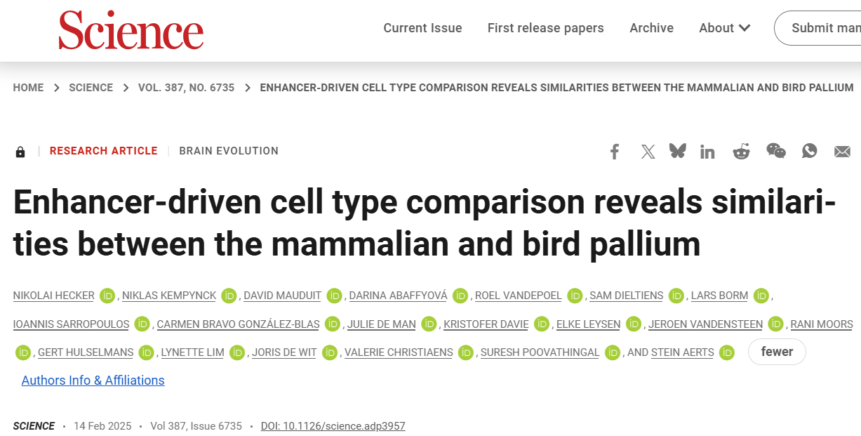 2025年2月,比利时鲁汶大学联合多国科研团队,在Science发表了一项具有里程碑意义的研究。该工作整合了鸡端脑的单细胞多组学与Stereo-seq空间转录组数据,并利用深度学习模型从基因组增强子序列中解码细胞类型的调控密码,系统比较了鸟类与哺乳动物的大脑。