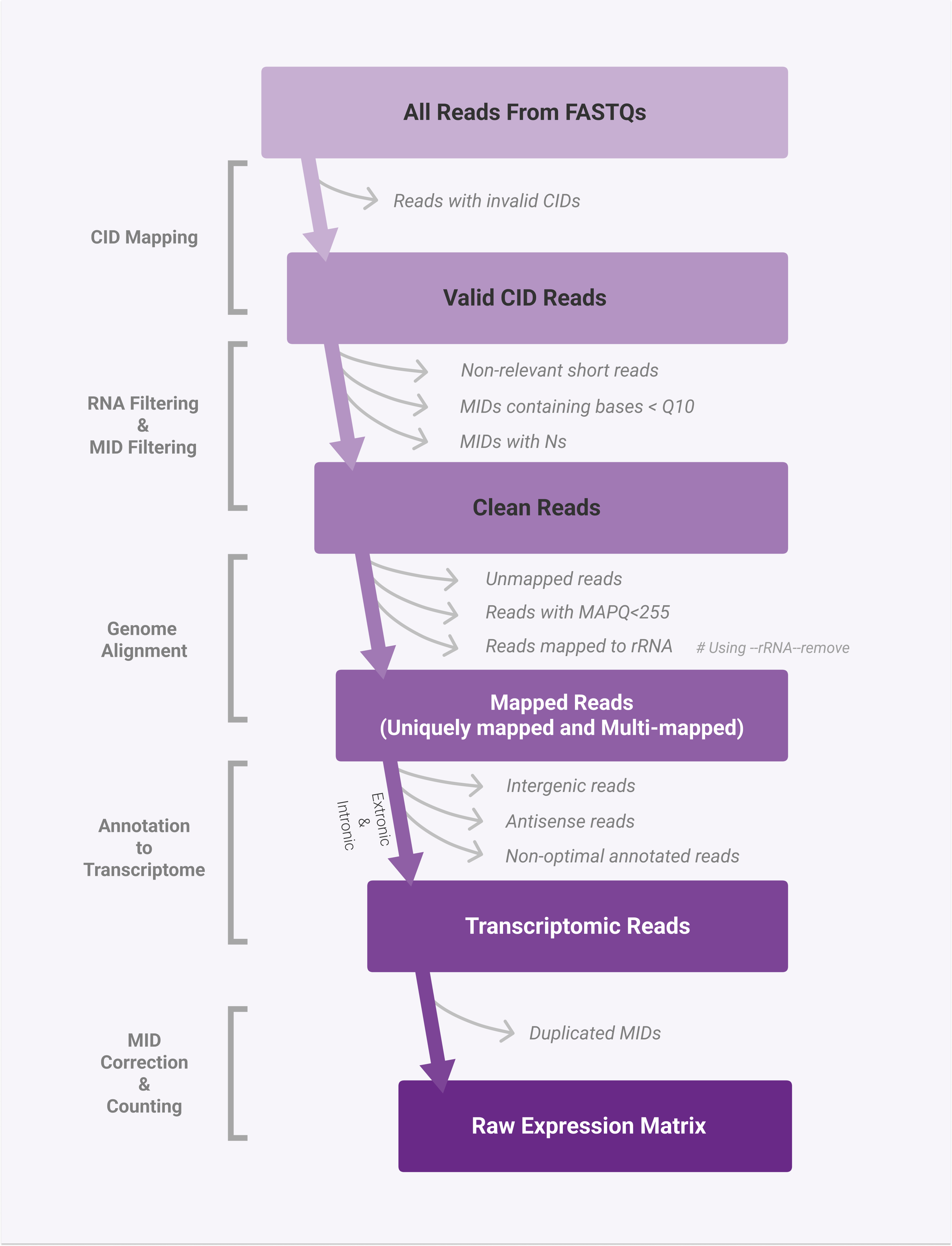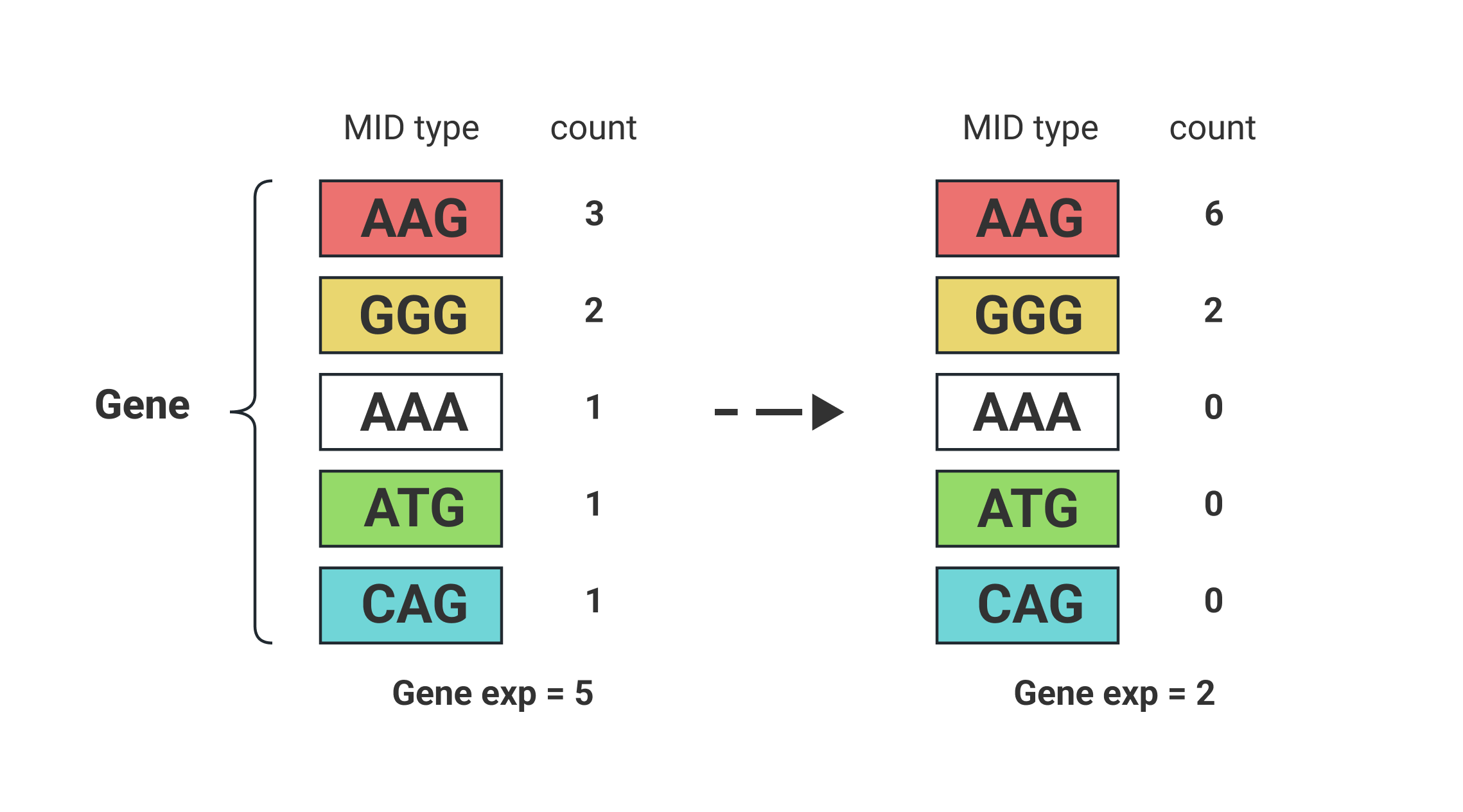 At a position, if the MID counts of a certain gene >= 5, they will be corrected. After sorting the MID counts of a specific gene in descending order, the numerical values are corrected following the fundamental principle that allows a Hamming distance of 1. After correction, a tag of UB:Z:XXXXX will be added to the record.