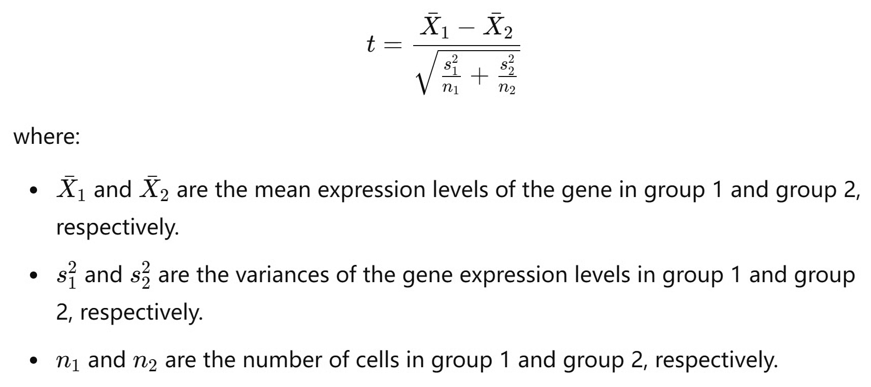 - Expression levels: for each gene, the expression levels are compared between the two groups of cells.