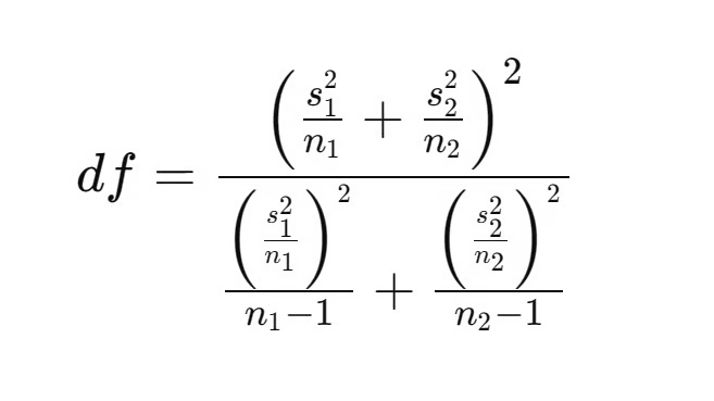 - Degrees of freedom: the degrees of freedom (df) for the test are calculated, often using a formula that takes into account the sample sizes and variances of both groups. A common formula is: